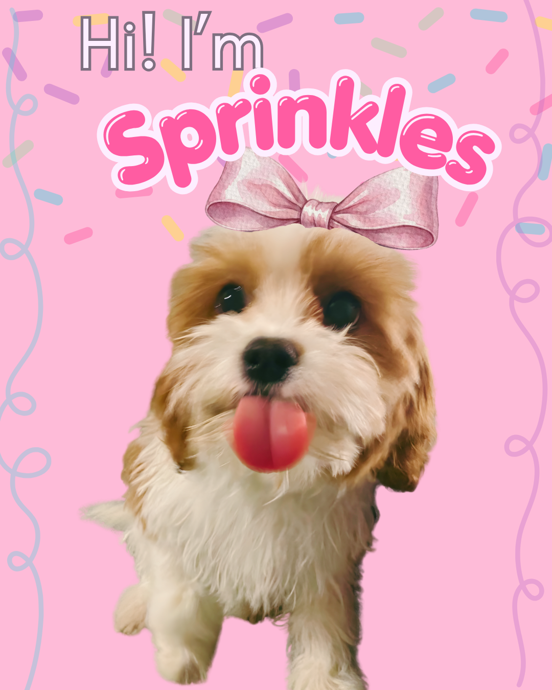 Sprinkles is a blenheim colored F1 Cavapoo from Dottie and Winston, she is living her best life in a guardian family until she is ready to breed sometime winter 2026/early 2027. She will be a mom to some f1b cavapoos with Cowboy! We are SO excited for her to be a future momma.