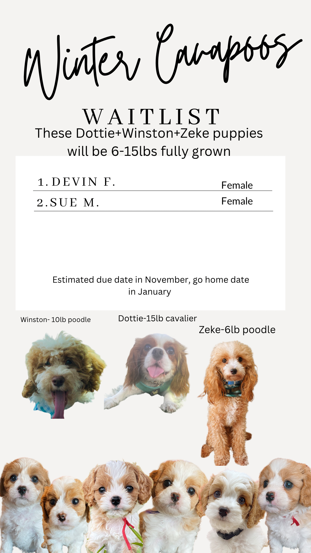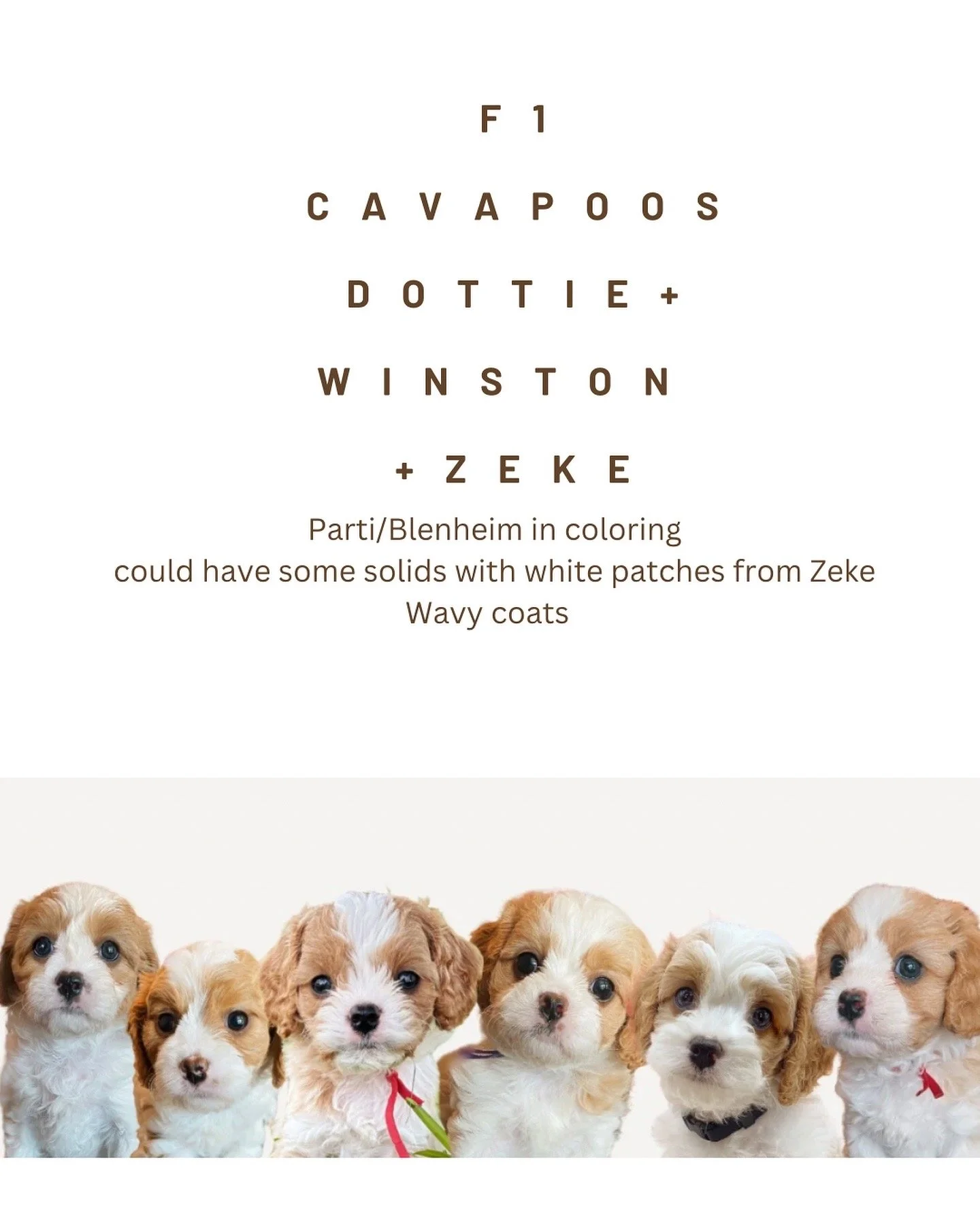 We will be having another litter of Cavapoos estimated November 25th, with an est. January 20th go home date. These puppies will be the same mom and dad- Dottie and Winston. Dottie is a 15lb King Charles Cavalier, and Winston is a 10lb toy poodle. These puppies estimated weights based on past litters is 8-13lbs fully grown. All Cavapoos in this litter will be $3500. They will all have a wavy coat and be parti in coloring.