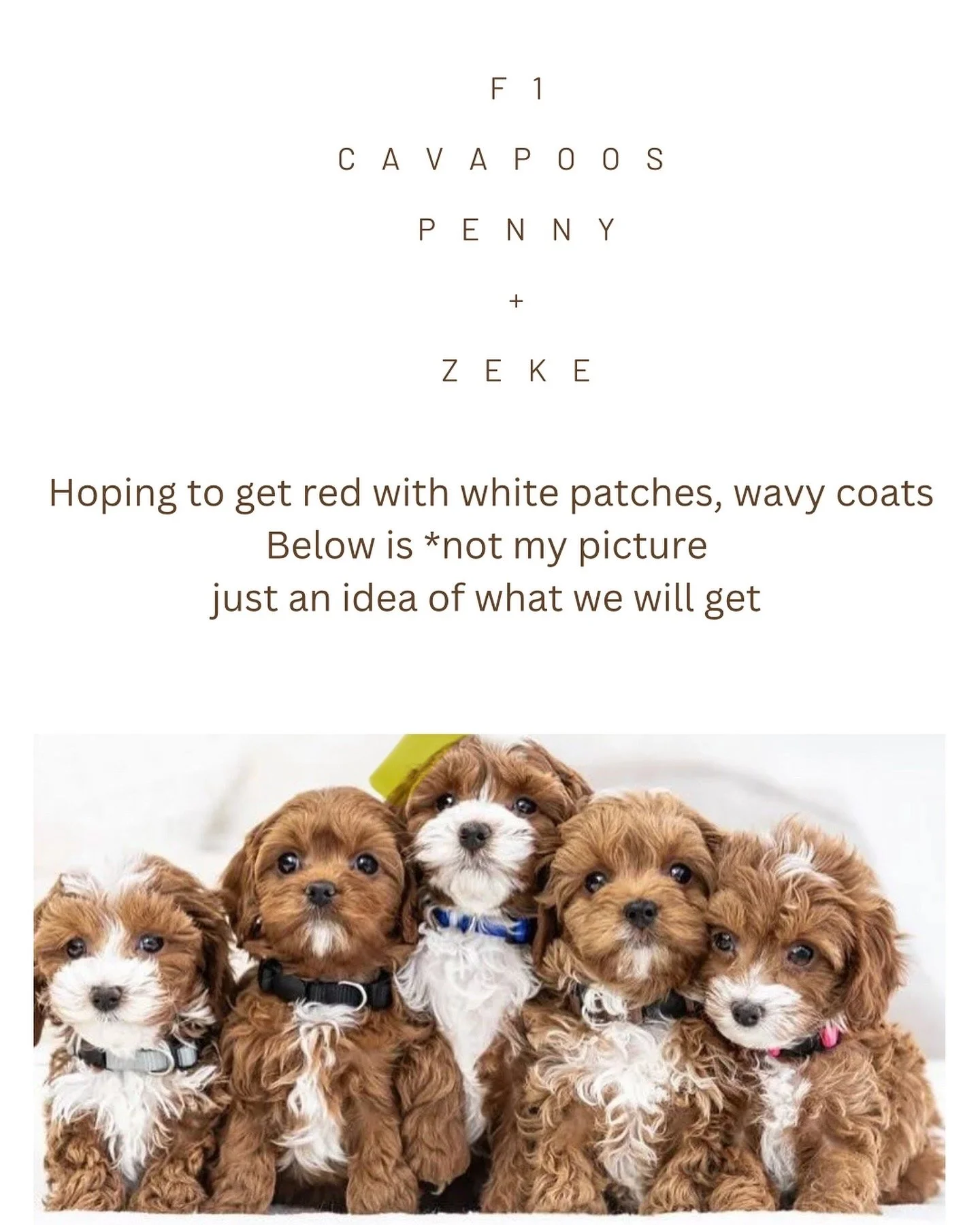 Penelope is our ruby colored King Charles Cavalier Spaniel who will start having puppies estimated February 2025 with a go home date in April. Zeke is a 5lb toy poodle who we will use as the stud dog. These puppies will be F1 cavapoos, we are hoping to get reds with white patches. They will be 5-10 lbs fully grown. All of the cavapoos will be $3500.