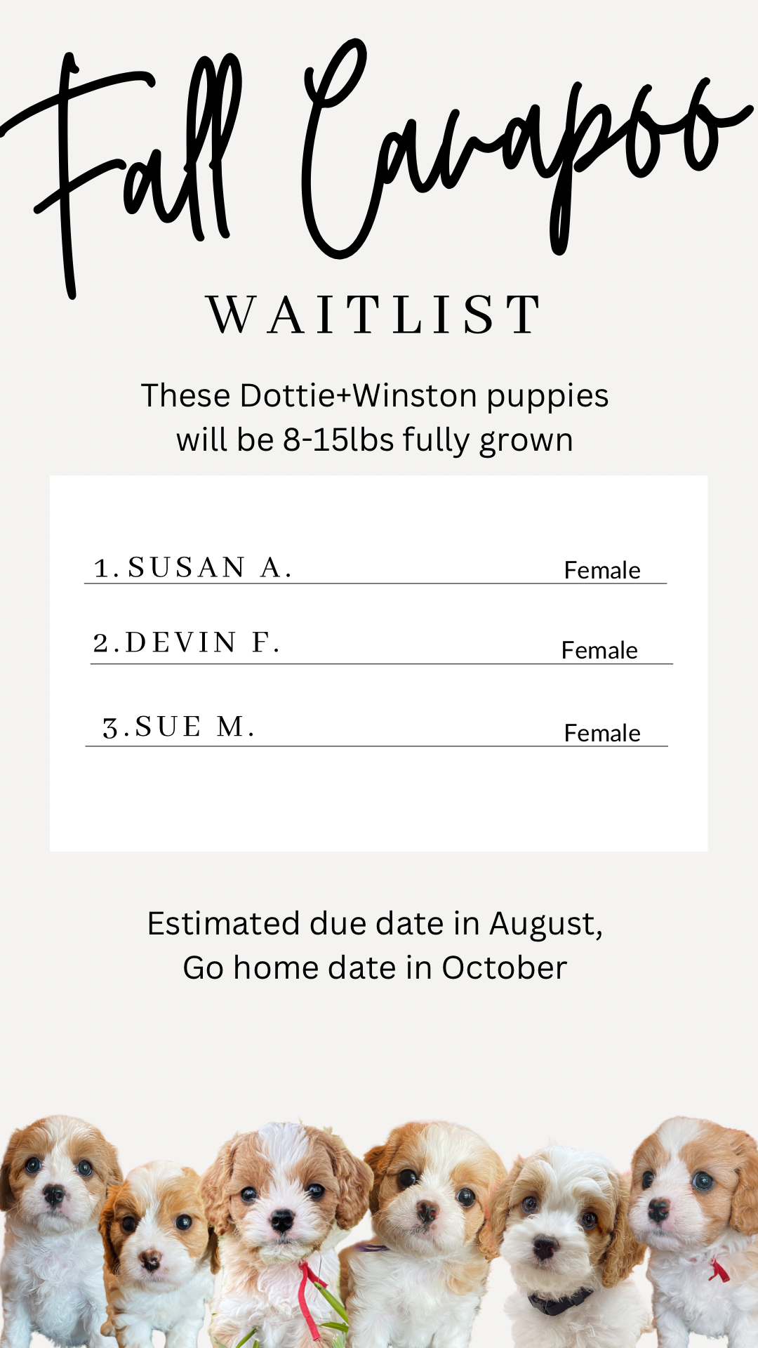 We will be having another litter of cavapoos around August 2024. These puppies will be the same mom and dad- Dottie and Winston. Dottie is a 15lb King Charles Cavalier, and Winston is a 10lb toy poodle. These puppies estimated weights based on past litters is 8-15lbs fully grown. All cavapoos in this litter will be $3500. They will all have a wavy coat and be parti in coloring.