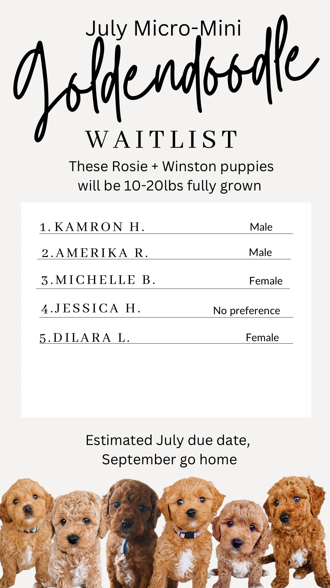 We will have anothe repeat litter estimated end of July. Rosie is a 25lb F1 Golendoodle, Winston is a 10lb toy poodle. These puppies will be 10-20 lbs, and have wavy-curly coats and range in coloring from apricot to dark brown. All of Rosies puppies will be $3000. If you are interested in getting on the waitlist for one of these puppies please head to the wait list FAQ page for all the info on how the wait list works, then fill out a new puppy application to be considered.